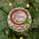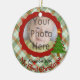 Divertido y adorable adorno de Navidades de fotos personalizados. Genial para la primera navidad del bebé. Añade tu propia foto digital y titular. Cuenta con fondo blanco, rojo canela y dorado con marco de foto frilly y árbol de vacaciones de Navidades lindos con estrella dorada.