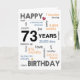 Tarjeta de cumpleaños en el interior: Que su día especial esté lleno de alegría, risas y momentos inolvidables que usted puede apreciar en los próximos años. ¡Deseándote toda la felicidad del mundo en tu cumpleaños y siempre! Descripción: conmemoremos el increíble hito de cumpleaños 73 con nuestra deliciosa tarjeta de cumpleaños número 73. Ya sea por tu querida madre, querido papá, querido hermano, o querida hermana, esta tarjeta ofrece una encantadora vía para expresar tus sentidos deseos y bañarlos con alegría y amor en su día especial. El frente de la tarjeta muestra orgullosamente "Feliz Cumpleaños" junto con el significativo número 73, representado en décadas, años, meses, semanas, días, horas, minutos y segundos, subrayando el significado de esta memorable ocasión.
