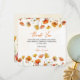 Esta encantadora tarjeta de agradecimiento "Baby in Bloom" cuenta con adornos acuáticos suaves en tonos vivos de naranja y melocotón, perfecta para una ducha de primavera o verano. El borde floral rodea un mensaje de gratitud sincero, que combina con gusto calidez y elegancia. Con un formato cuadrado limpio y un guión moderno, esta tarjeta es ideal para agradecer a los invitados su amor y sus regalos. El delicado diseño floral y la temática estacional lo convierten en una encantadora opción para las duchas infantiles de inspiración rústica, boho o jardín. Personalice los nombres de los padres para que le den un toque final cuidadoso.