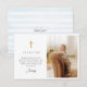 Carta de agradecimiento al bautismo que incluye rayas azules y una cruz azul simple sobre un fondo de marfil.