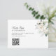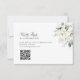 Una tarjeta boda RSVP de código QR con letras negras simples, follaje eucalipto y flores blancas.