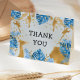 Esta "salvaje" jungle safari temática niño de primer cumpleaños fiesta de agradecimiento tarjeta incluye animales de Relieve metalizado de imitación dorados (jirafa, león y monos), follaje de jungla dorada y azul, y una rociada de confetti dorado en un fondo azul pálido. Las palabras "Gracias" aparecen en la parte delantera; personalizan el mensaje interior, o borran para escribir notas individuales a los invitados.