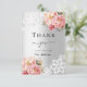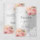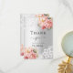 Una moderna y elegante ducha de novia con tarjeta de agradecimiento. Un fondo falso plateado. Decorada con rosas rosas rosas rosas de color rosa, flores y encaje. Al frente del texto: Gracias, futuros señores. Parte posterior: plantilla para su nota de agradecimiento y nombre.