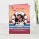 Una boda de crucero hermosa gracias por el regalo de bodas/asistencia Tu foto, plantilla de marco de tarjeta personalizada y personalizada. Esta tarjeta temática de crucero al atardecer presenta una vista del barco de crucero al atardecer con aves y marco de guardavidas para que cargues tu foto de boda, diseño gráfico de XG Designs NYC. Esta tarjeta está en forma de marco de plantilla lista para que cargues una foto, personalices el texto y la personalices con tus nombres. Coincide con nuestras invitaciones de boda temáticas de crucero al atardecer. Si deseas editar/cambiar el estilo de letra o los colores, simplemente haz clic en 'personalizar' y esas opciones también estarán disponibles para ti. ¡Mira nuestra tienda para otras invitaciones temáticas de crucero, tarjetas de agradecimiento, salva la fecha, sellos, favores, regalos y más! Imagen de muestra de novia y nov