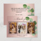 Añade 3 fotos de tu cumpleaños, tamaño vertical, una fecha, nombre y la nota de agradecimiento. Un fondo de aspecto metálico falso de oro rosa con texto y marco negro, un espiral de eucalipto. El texto: Gracias en la parte delantera y tu nombre en la parte trasera está escrito con un elegante guión con letras a mano con barras.
