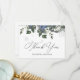 Tarjeta de agradecimiento que incluye flores invernales azules, copos de nieve y siempreverde. Personaliza con tu información o haz clic en "Clic para personalizar más" para editar estilos, tamaños y colores de letra. Ajusta el texto para una boda o algún otro evento.