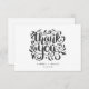 Una bonita tarjeta de agradecimiento de boda con caligrafía ornada rodeada de elementos de hoja simples y ornamentados y sus nombres y fecha de boda en una fuente moderna minimalista simple.