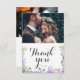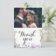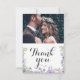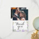 Esta tarjeta de agradecimiento de boda rústica muestra un original arte de acuarela de delicadas flores púrpuras y eucalipto verde salvia, aportando una elegancia natural a tu mensaje sincero. Con caligrafía elegante y espacio para dos de tus fotos de boda favoritas, esta tarjeta captura hermosamente el espíritu de tu día especial. Perfecta para agregar un toque personal y memorable, te permite expresar tu gratitud de una manera que amigos y familiares apreciarán.