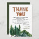 Tarjeta de agradecimiento de cumpleaños infantil con árboles y montañas rústicos acuarelados.