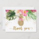 Esta tarjeta de agradecimiento de despedida de soltera veraniega tiene hermosas flores tropicales de acuarela con confeti de purpurina dorada falsa y una piña de purpurina dorada falsa. La caligrafía dorada coordinada complementa el hermoso diseño floral.