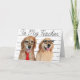 Esta graciosa tarjeta de saludo muestra una fotografía de dos sonrientes perros recuperadores de oro que llevan corbata y lentes de nerd. El fondo en el frente es una hoja de papel hoja suelto con las palabras "A mi profesor" escrito en letra cursiva. El texto interno dice: "¡Gracias por todo lo que haces!", pero esto se puede cambiar o borrar fácilmente. Perfecto para el Día/Semana de Apreciación de los Maestros en Mayo.