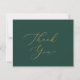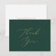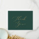 Esta delicada tarjeta de agradecimiento verde caligrafía dorada es perfecta para un boda moderno. El romántico diseño minimalista presenta una encantadora y elegante tipografía de champán amarillo dorado sobre un fondo verde esmeralda con un aspecto limpio y sencillo. Personalice la parte posterior de la tarjeta con sus nombres y un mensaje de agradecimiento. Como alternativa, deje en blanco la sección de plantilla de mensajes de agradecimiento para escribir a mano una nota personalizada en cada tarjeta después de su llegada. Estas tarjetas se pueden usar para un boda, una ducha de novia o cualquier evento especial.