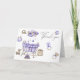 La invitación muestra acuarela, cuna de bebé, un vivero móvil en forma de nubes redondas moradas, juguetes para niños: un elefante de roedor, un pato sobre ruedas, un oso de peluche, un conejito, un bib, un pacificador, una pirámide.