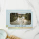 Elegante tarjeta de fotos de Gracias de boda, con tu propia foto boda enmarcada por un azul polvoriento con diseño de líneas doradas en un lado y una escena de montaña pintada en el otro.