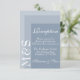 Sencilla y moderna tarjeta de boda de escritura de moda para novias que están adornando sus ceremonias en un estilo moderno y polvoriento color azul. La suite boda de moda tiene un tipo de letra blanco moderno con las iniciales monograma en un lado.