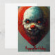 Payaso malvado con sonrisa malvada en globo rojo deseando tu feliz cumpleaños