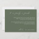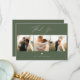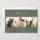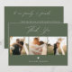 Elegante caligrafía 3 foto, boda carta de agradecimiento en color verde musgo. Características, 3 espacios de fotos cuadrados en la parte delantera, caligrafía gráfica "Gracias", acento cardíaco, líneas de texto de plantilla para sus nombres y mensaje personalizado.