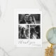 Expresar su gratitud con estilo con esta tarjeta de agradecimiento del boda de personalizable. Con espacio para múltiples fotos y un elegante tipo de letra de guión, este moderno diseño de collage le permite mostrar sus recuerdos bodas favoritos. Personalice con sus nombres, fecha de boda y fotos para crear un sentido paladar para la familia y los amigos. Una manera atemporal y elegante de agradecer a sus invitados por ser parte de su día especial.