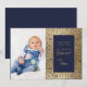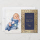 En la mitad izquierda, hay una foto de bebé de marcador de posición que debe reemplazar. En la mitad derecha, el texto está escrito en un marco dorado floral vintage con decoraciones intrincadas de rosas silvestres, sobre un fondo azul marino. El rol "Padrinos" y el nombre del niño están escritos en letra caligráfica, el resto en mayúsculas. Todo el texto tiene un color dorado, como el marco dorado.