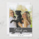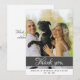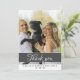 Elegante y moderna tarjeta de agradecimiento de tipografía. Diseño sencillo en tonos grises y blancos oscuros con una plantilla de fotos - inserte su foto en la plantilla. El texto de Gracias está en la tipografía blanca de moda - personalizar los nombres de novias y novios y la fecha de boda. El mensaje de agradecimiento está al revés - puedes dejar, cambiar o borrar el mensaje. Haga su propia tarjeta de agradecimiento a su boda para agradecerle a los invitados bodas.