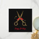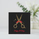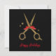 Estas tijeras de purpurina doradas hacen una tarjeta perfecta para su negocio. ¡El texto es fácil de ajustar! Una combinación clásica de color negro y dorado. Elegante plantilla de peluquero con cinta roja.