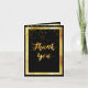 Un color de fondo negro de moda y un marco dorado falso. Con una lluvia dorada de confeti. Delante hay un guión con letras a mano y el texto: ¡Gracias! y una decoración floral de imitación de oro. Interior: Plantilla para Su nota de agradecimiento y nombre/nombres. Plantilla para su foto. Parte posterior: Plantilla para su segunda foto.