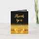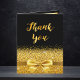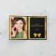 Un elegante fondo negro y un falso arco dorado y cinta de correr con purpurina dorado y brillo. Delante un guión con letras a mano y el texto: ¡Gracias! Interior: Plantilla para tu foto, nota de agradecimiento y nombre/nombres. Parte posterior: Plantilla para su segunda foto.