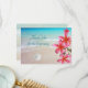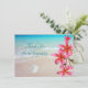 Carta de bienvenida plana "gracias" con flores tropicales y escena de playa. El texto azul en la parte delantera es fácil de personalizar y la muestra es, "Gracias por la hospitalidad". El agua azul del océano y la arena de la playa, con un poco de arena blanca, son la imagen de fondo. Frangipani rosa, o plumeria, flores decoran el borde de la tarjeta. Otra escena de la playa es el fondo de la parte de atrás, donde se puede escribir una nota de apreciación. Este diseño también funciona en las tarjetas de 5 x 7 pulgadas.