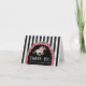 Esta tarjeta de agradecimiento con tema Derby tiene un caballo de carreras al estilo acuarela con un jinete de rosa rodeado de una corona de rosas rojas con el dicho "Gracias" Hay un fondo a rayas en blanco y negro.