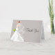 Una novia pelirroja mira discretamente sobre su hombro sobre un fondo suave gris con patrón de damasco en esta tarjeta. Su mensaje de agradecimiento personalizado en verde oscuro rodea a ella. Agregue su propio mensaje personalizado en el interior. Perfecto agradecimiento para acompañar invitaciones, favores y franqueo a juego. Disponible en colores alternos con una variedad de colores de piel/cabello/ojos para la novia. Contácteme a través de mi tienda si prefiere un fondo diferente.