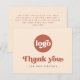 Tarjeta de agradecimiento profesional que incluye el texto "Gracias" en una fuente de estilo retro. Texto marrón terracota (o color personalizado) sobre un fondo más pálido. Carga tu logotipo en la parte delantera y añade texto personalizado en la parte posterior. Puede cambiar los colores, mover y redimensionar elementos con la herramienta de diseño.