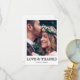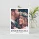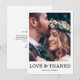 Esta elegante tarjeta postal de agradecimiento a tu boda tiene una foto en la parte delantera con el texto de Amor y Gracias y los nombres de la pareja. La parte trasera tiene tu propio mensaje personal, y otra foto. El gradiente sobre la foto de la parte delantera se puede eliminar o reorganizar mediante la opción personalizar.