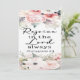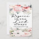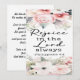 Una hermosa tarjeta floral con "Regocijarse en el Señor siempre" filipinas 4:4 "Que esto sea un recordatorio suave: No importa la temporada, el Señor está cerca. Incluso en los juicios, hay alegría en Su presencia. Levanta tu corazón, refresca tu espíritu, y tu alma anclada en la alegría que sólo Él da. Respira hondo. Sonríe. Dios sigue siendo bueno. Y esa es siempre una razón para regocijarse." es la cita en la parte trasera de esta tarjeta plana.