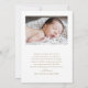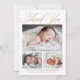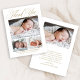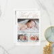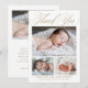 La tarjeta de agradecimiento para bebé con guión dorado elegante simple 4 fotos presenta tres fotos del nuevo bebé, junto con elegante caligrafía de guión, y todos los datos del bebé. La parte trasera tiene mucho espacio para tu nota de agradecimiento.