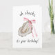 Esta tarjeta de cumpleaños incluye un retrato acuarela de una ostra adornada con un arco rosado.