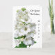 Una tarjeta de saludo para el cumpleaños de la madre en el frente es una flor blanca con su madre de cumpleaños