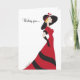 Chica con un vestido rojo brillante y guantes negros largos y usando un gran gorra negro con una cinta roja.