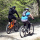 El ciclismo de montaña a lo largo de los senderos forestales en Gales.
