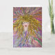 Una tarjeta de bienvenida contemporánea muy colorida con una mujer encantadora centrada, los ojos cerrados y el pelo flotante. ¿Está meditando, pensando, durmiendo? Estas imágenes caprichosas permiten al proveedor y al receptor de la tarjeta crear su propia historia. Una imaginativa y caprichosa imagen replicada de una pintura original acertadamente llamada "Bella". Ha sido replicada en muchas formas, la mayoría de ellas en camisetas femeninas.