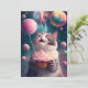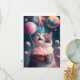 tarjeta de cumpleaños con un lindo gato con un quequito rosado y globos rosados. Todas nuestras tarjetas se pueden personalizar a su gusto pulsando el botón "Editar diseño" antes de añadir el elemento al carrito.