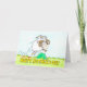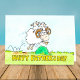 Esta tarjeta de un padre adorable, dibujada al estilo personalizado, muestra un carnero saltando sobre un arbusto verde parado en una pradera, frente a un cielo azul. La oveja macho tiene dos corderos en la espalda que claramente están divirtiéndose mucho con su padre. Debajo de ellos, en las gras, las palabras "Feliz Día del Padre" están escritas en negritas letras amarillas escritas a mano.