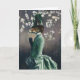 Esta tarjeta se ilustra con un vixen victoriano vestido con un traje de bullicio contra un fondo de magnolias.