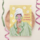 Mujer moderna colorida con una toalla alrededor de la cabeza, pepino en los ojos, una mascarilla rosa y pijama a rayas verde salvia para tus deseos de cumpleaños. Bebe un cóctel saludable y el papel pintado amarillo en el centro de belleza presenta pequeñas flores de margarita blancas. Obra de arte original de Caroline Bonne Müller