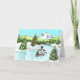 ¡Envíen alegres saludos de Navidad! Un muñeco de nieve en un tablero SUP (Stand-Up Paddleboard) rema por el río rodeado de árboles de Navidad, con puente rojo y montaña nevada en el fondo.