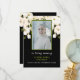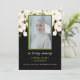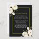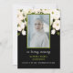 Este elegante diseño de poema Memorial cuenta con una cascada de flores de rosas blancas y hojas verdes sobre fondo negro con texto elegante en verde y blanco. Añadir una foto en un marco verde. El reverso de la tarjeta poema es simple color negro con flores blancas de moda y texto poético en un marco verde .