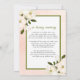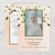 Este diseño de Poema Memorial Romántico presenta rosas blancas de acuarela y follaje verde sobre un fondo de color rosa melocotón claro con texto elegante en verde y negro. Agrega una foto en el marco de follaje. La parte posterior de la tarjeta del poema es de color rosa melocotón claro con flores blancas chic, y un marco de follaje con texto del poema.