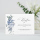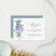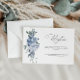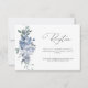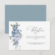 Una moderna tarjeta de recepción de bodas con escritura negra y flores azul polvoriento color agua.