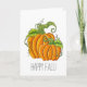 ¡Envíe saludos de otoño con esta tarjeta temática de calabaza! La carta presenta un ilustracion de un par de calabazas, calabazas naranjas brillantes coronadas con curvas verdes. El mensaje "Happy Fall" está escrito debajo. La tarjeta está en blanco por dentro.