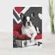 Tarjeta de San Valentín de Bulldog francés. Curiosamente canino frente a un fondo contemporáneo en rojo, negro y blanco. No hay flores, solo corazones y bolsas de cortesía. El interior se deja en blanco para tu propio mensaje.
