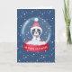 Un dibujo festivo de un Boston Terrier blanco y negro en un globo de nieve en caída de nieve. El mensaje interior dice "¡Feliz Navidad!"